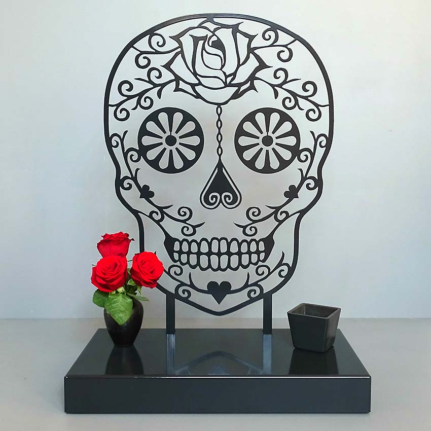 Abmessungen (HxBxT): Plateau 30,0 x 15,0 x 2,5 cm, Querschnitt Kreis Stahl Zuckerschädel 37,0 x 28,0 cm, 2 mm dick