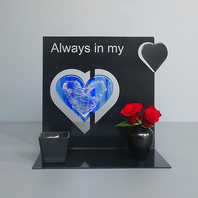 Abmessungen (HxBxT): Plateau: 28,0 cm x 15,0 cm x 2,5 cm, Stahlobjekt 28,0 cm bei 28,0 cm, Asche Herz 11,0 cm x 8,0 cm, 2 mm dick